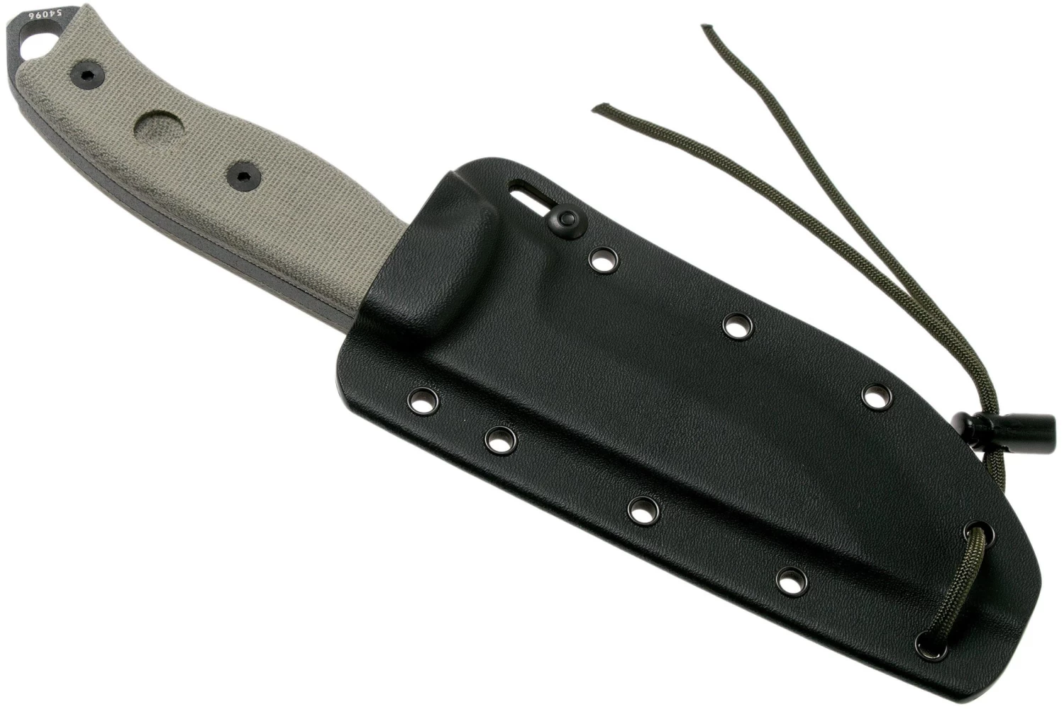 El ESEE Model 5 es un sólido cuchillo de supervivencia con una hoja fabricada en acero al carbono 1095. El revestimiento en polvo extremadamente sostenible de la hoja la protege de la sensibilidad a la corrosión del acero carbono. Las maravillosas cualidades de uso del acero garantizan una vida de diversión. La hoja full-tang se ha mejorado con un mango de micarta. Este mango se siente un poco rugoso, lo que es estupendo para el agarre y la comodidad. El ESEE Model 5 es un cuchillo grande y sólido que puede aguantar un uso extremadamente intenso. En comparación con los otros modelos de ESEE, el ESEE 5 está mejorado con una hoja relativamente gruesa de 6,5 cm. Si su tamaño y peso pueden ser demasiado, el Model 4 o el Model 3 son excelentes alternativas más pequeñas.