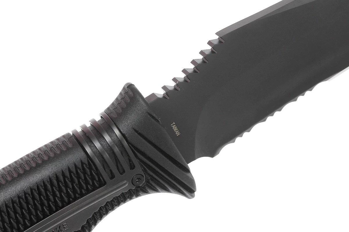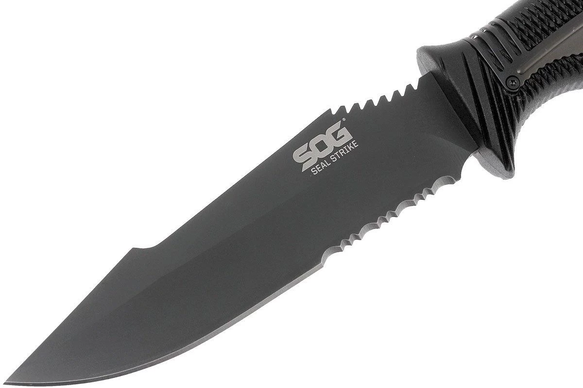 El SOG Seal Strike es un cuchillo sólido y resistente, característico de la marca SOG. SOG tiene una reputación que mantener cuando se trata de estos cuchillos de combate. El SOG Seal Strike cumple totalmente con las altas expectativas. El mango de nylon reforzado con fibra de vidrio y acero inoxidable se adapta bien a la mano. La hoja es full-tang, lo que significa que el acero se extiende por todo el mango. La hoja es de acero AUS8 con un borde parcialmente dentado. Ideal para cortar cuerdas y similares. La forma del dorso de la hoja ofrece un poco más de agarre cuando se utiliza el cuchillo con las dos manos para trabajos de precisión.